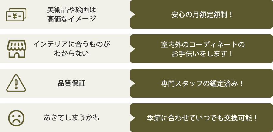 多様なライフスタイルの変化や必要に合わせて、「必要なときに必要な物を選ぶ」という美術品の使用をしてみませんか?サブティークはあなたのインテリアに合う美術品を提案。今まで憧れだけで手が出なかったあの絵画、あの器を好きなだけ使用できる自由で柔軟なアンティークとの付き合い方を提案するサービスです。